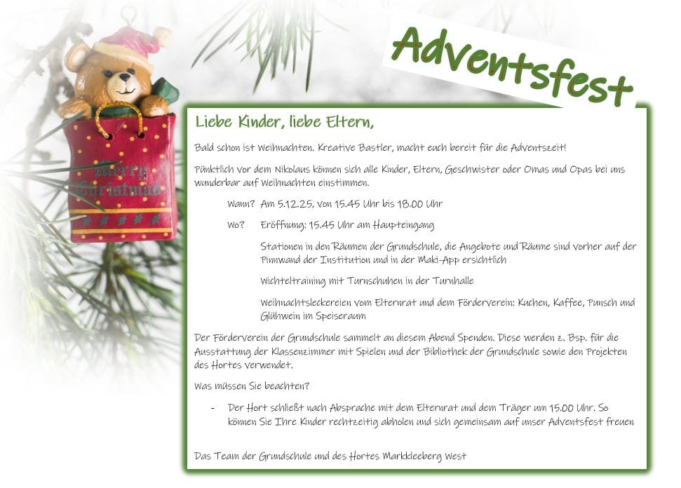 Am 05.12.2025 feierten wir unser diesjähriges Adventsfest. Stimmungsvoll eröffnet wurde es durch den Schulchor mit weihnachtlichen Liedern sowie durch einen Auftritt der Tanzgruppe. Im Anschluss konnten die Kinder gemeinsam mit…